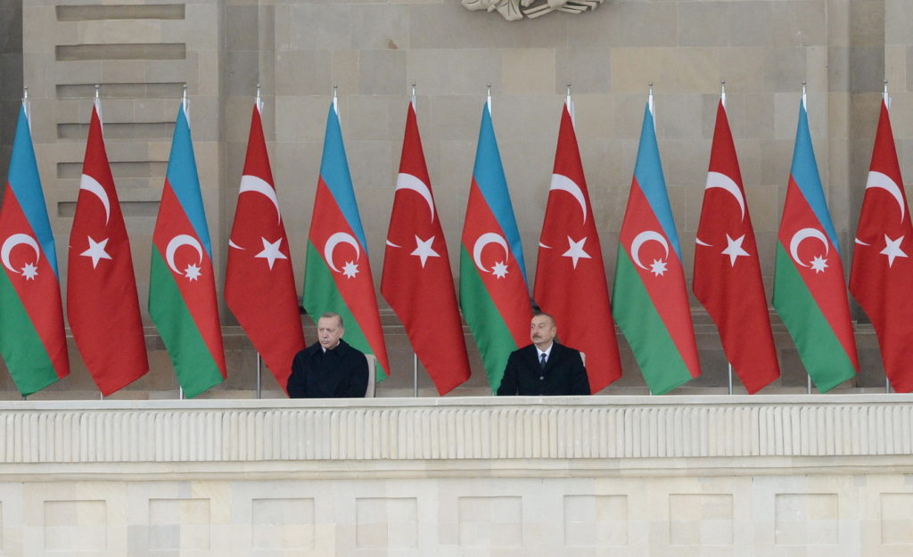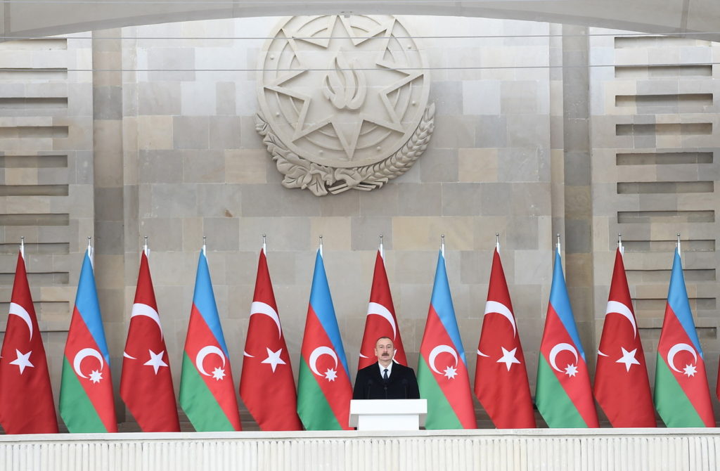 Bu gün tarixi bir gündür. Bu gün Azadlıq meydanında Zəfər paradı keçirilir. Mən çox şadam ki, bu paradda mənim dəvətimi qəbul edərək Türkiyə Cümhuriyyətinin Cümhurbaşqanı, əziz qardaşım Rəcəb Tayyib Ərdoğan iştirak edir. Eyni zamanda, Türkiyədən gəlmiş böyük nümayəndə heyəti, türk əsgər və zabitləri iştirak edirlər. Bu, bir daha bizim birliyimizi, dostluğumuzu və qardaşlığımızı göstərir.