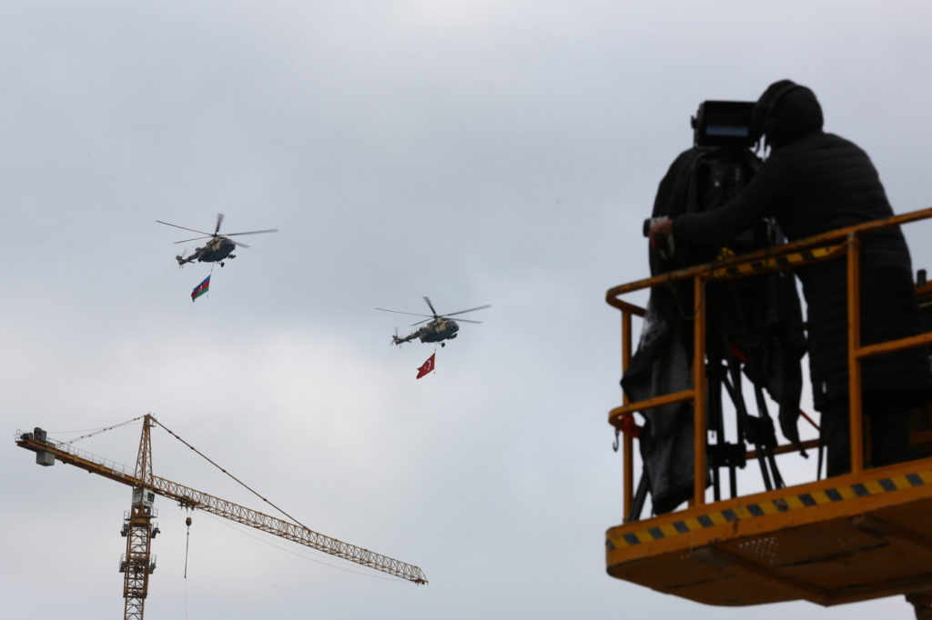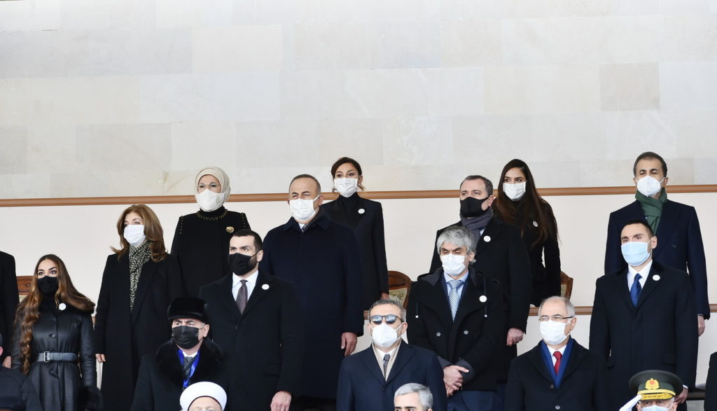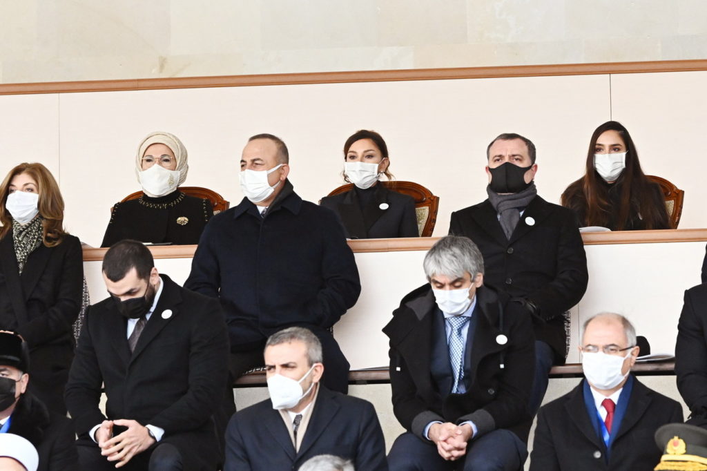 Azərbaycan Respublikasının Prezidenti İlham Əliyev, birinci xanım Mehriban Əliyeva, Türkiyə Respublikasının Prezidenti Rəcəb Tayyib Ərdoğan və xanımı Əminə Ərdoğan Zəfər paradında iştirak ediblər.