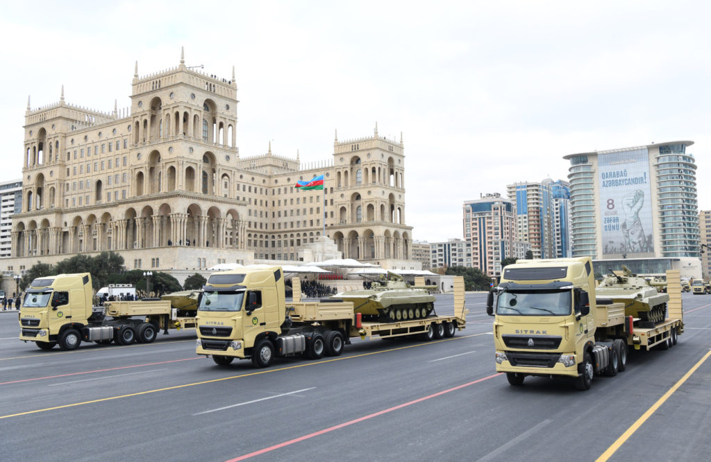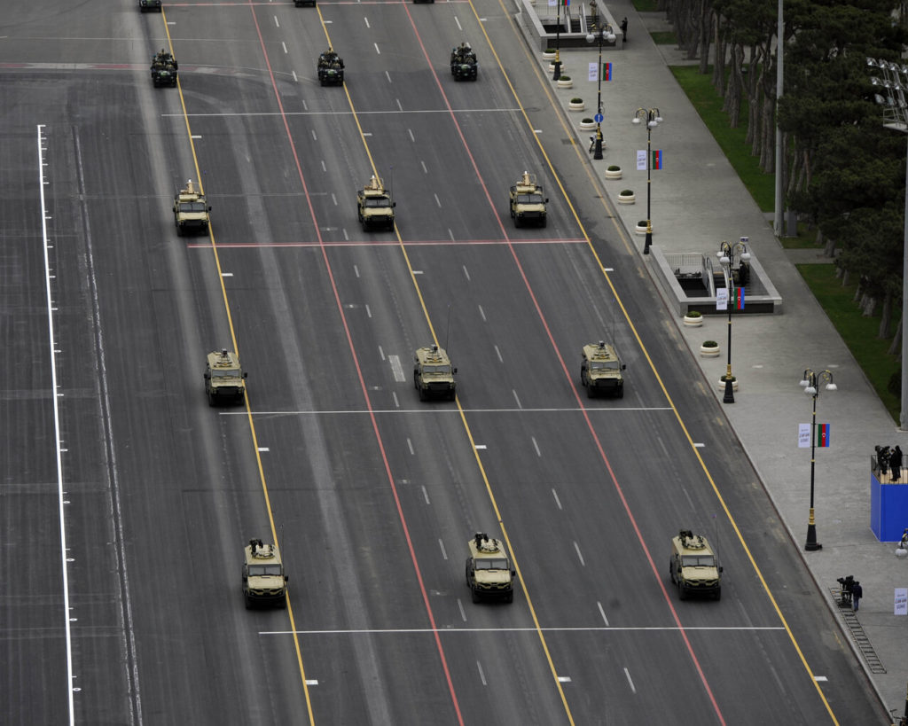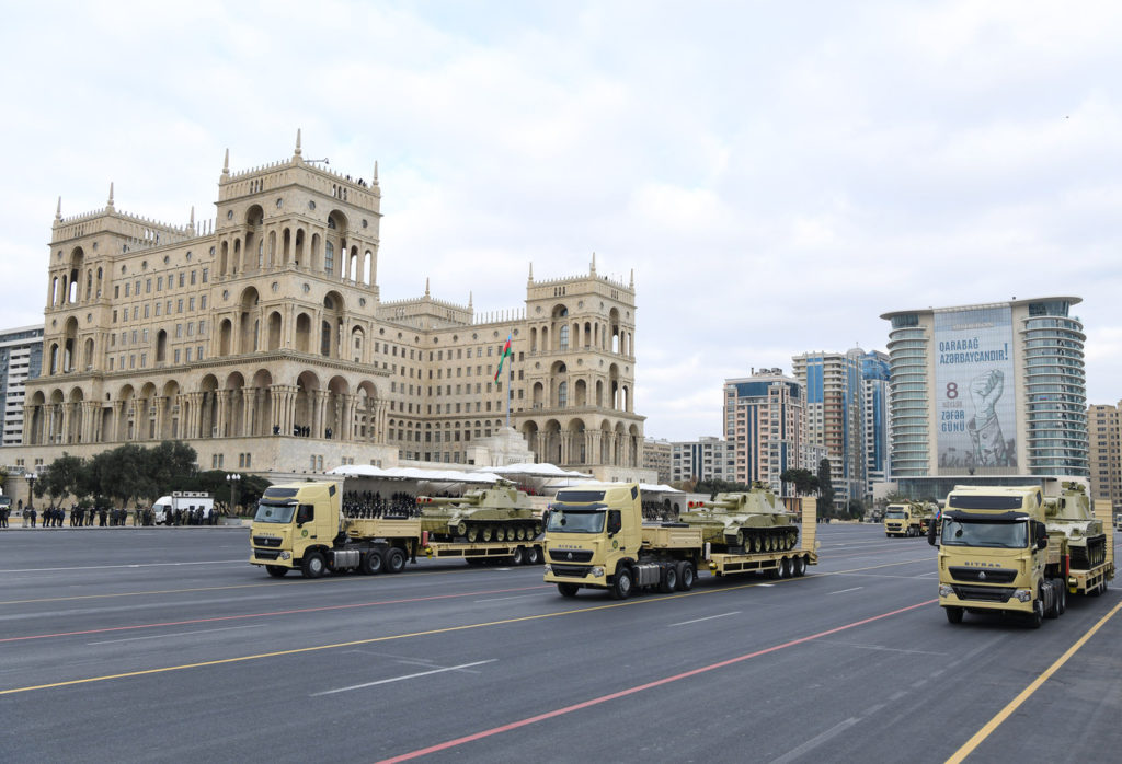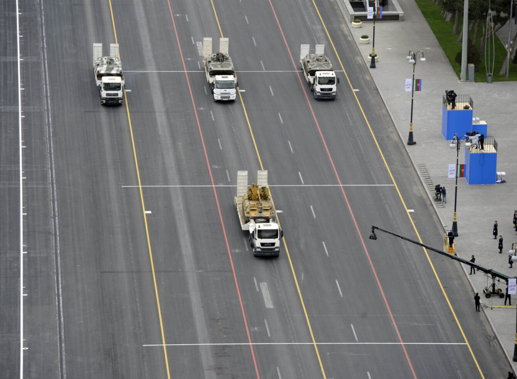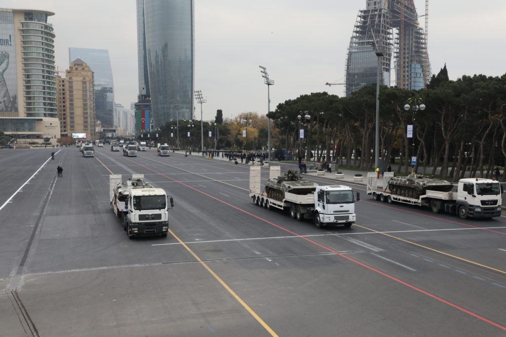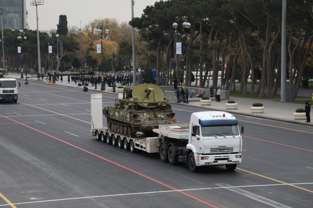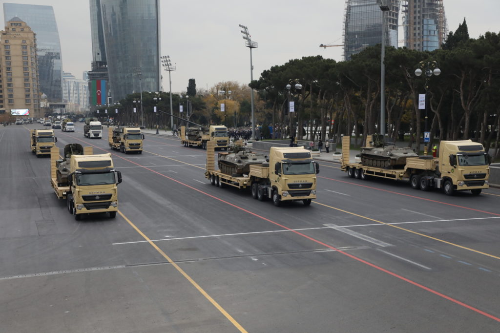 Azadlıq meydanında keçid edən, üzərində 12,7 millimetrlik NSV pulemyotları, tank əleyhinə idarə olunan “SPIKE-ER”, “NLOS”, “LAHAT” raketləri, 120 millimetrlik “SPEAR” minaatanlar quraşdırılan “SandCat-Stormer” zirehli idarəetmə, çevik hərəkət maşınları, piyada daşıyan zirehli maşınlar, “Kobra” və “BTR-82A” zirehli transportyorları, PDM-2 və PDM-3 texnikaları, “T-72”, “T-90S” tankları Azərbaycan Ordusunun hərbi qüdrətini nümayiş etdirdi.