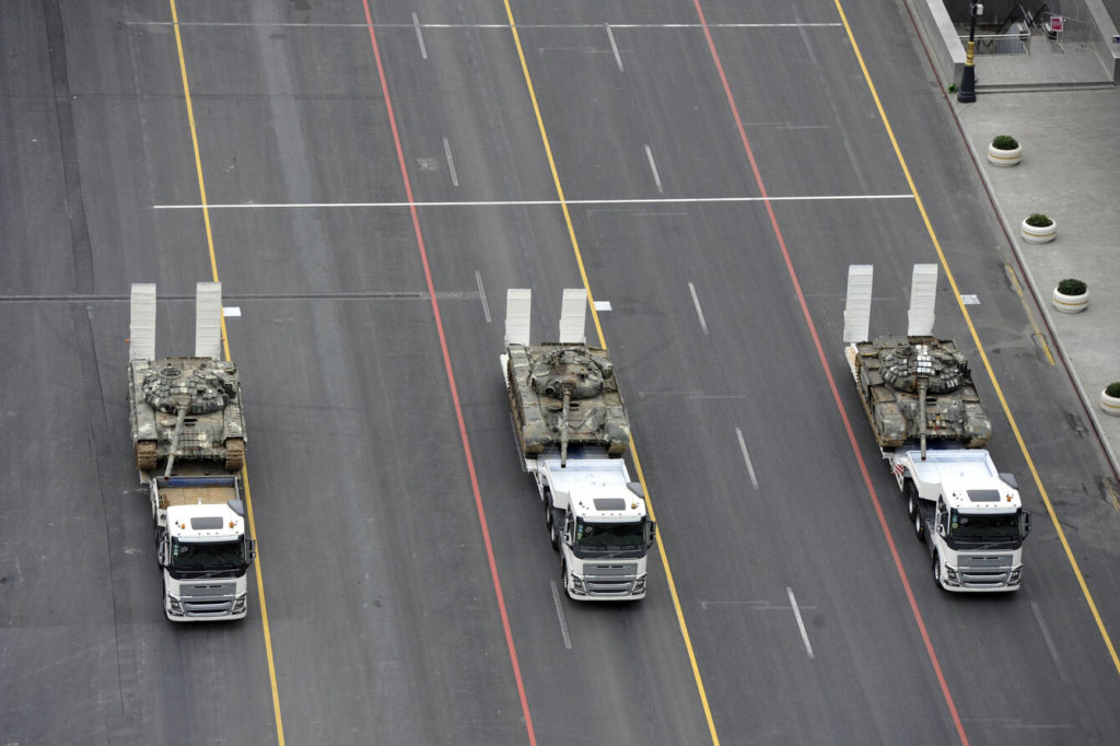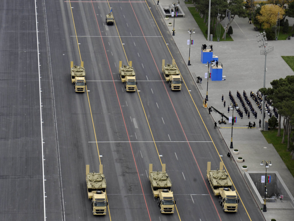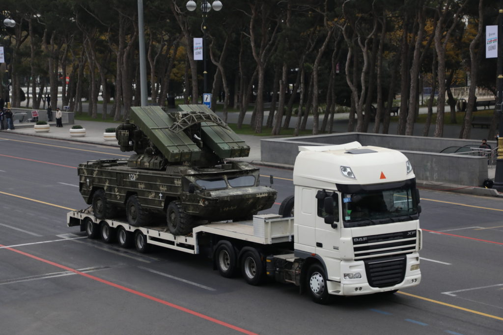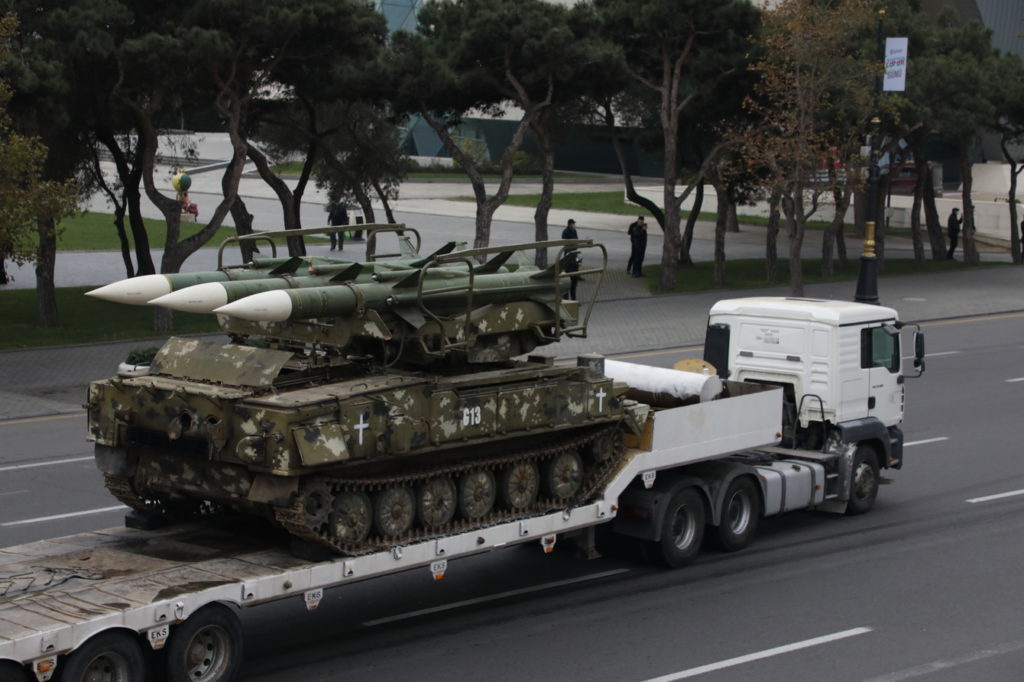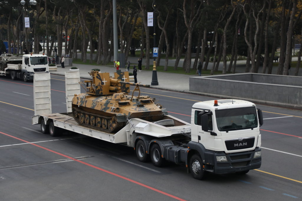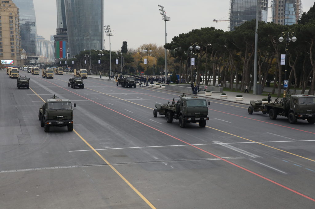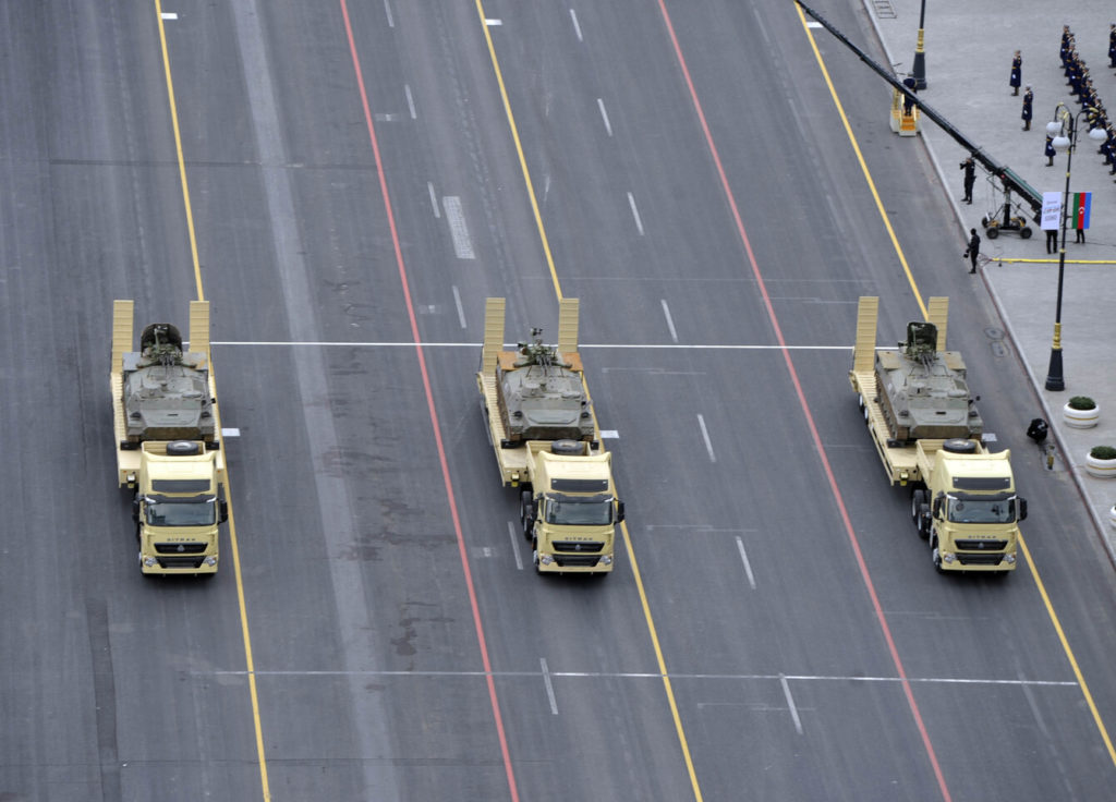 Azadlıq meydanında keçid edən, üzərində 12,7 millimetrlik NSV pulemyotları, tank əleyhinə idarə olunan “SPIKE-ER”, “NLOS”, “LAHAT” raketləri, 120 millimetrlik “SPEAR” minaatanlar quraşdırılan “SandCat-Stormer” zirehli idarəetmə, çevik hərəkət maşınları, piyada daşıyan zirehli maşınlar, “Kobra” və “BTR-82A” zirehli transportyorları, PDM-2 və PDM-3 texnikaları, “T-72”, “T-90S” tankları Azərbaycan Ordusunun hərbi qüdrətini nümayiş etdirdi.