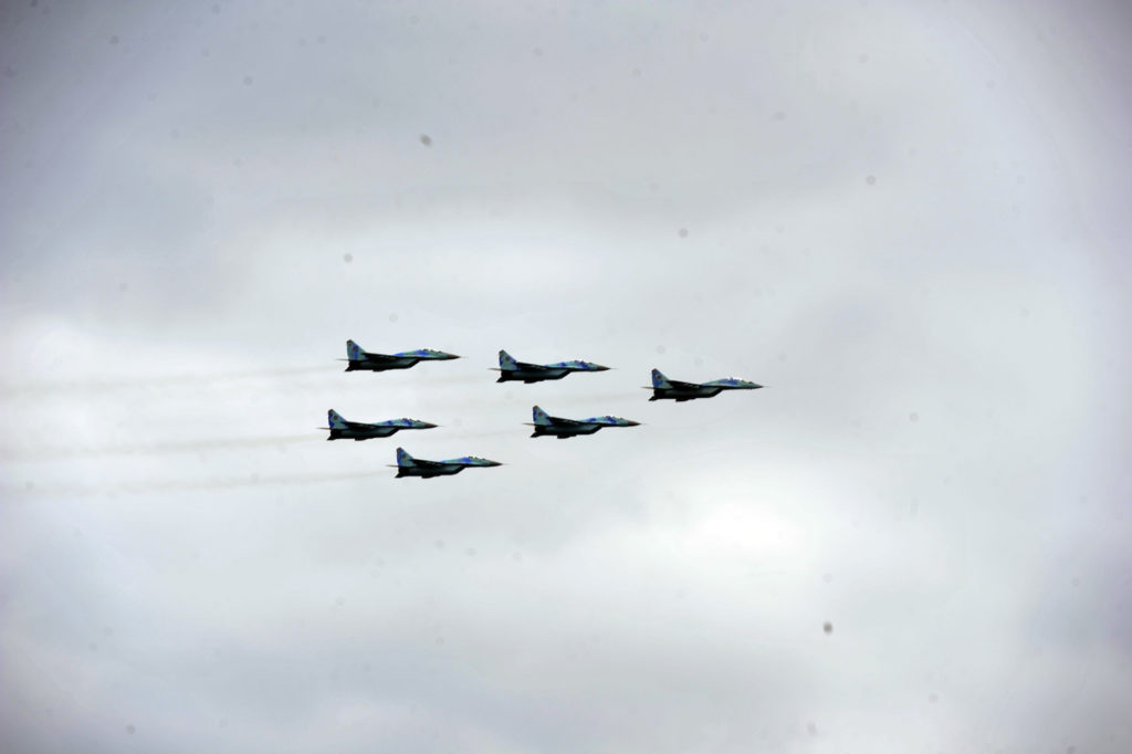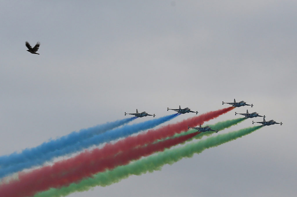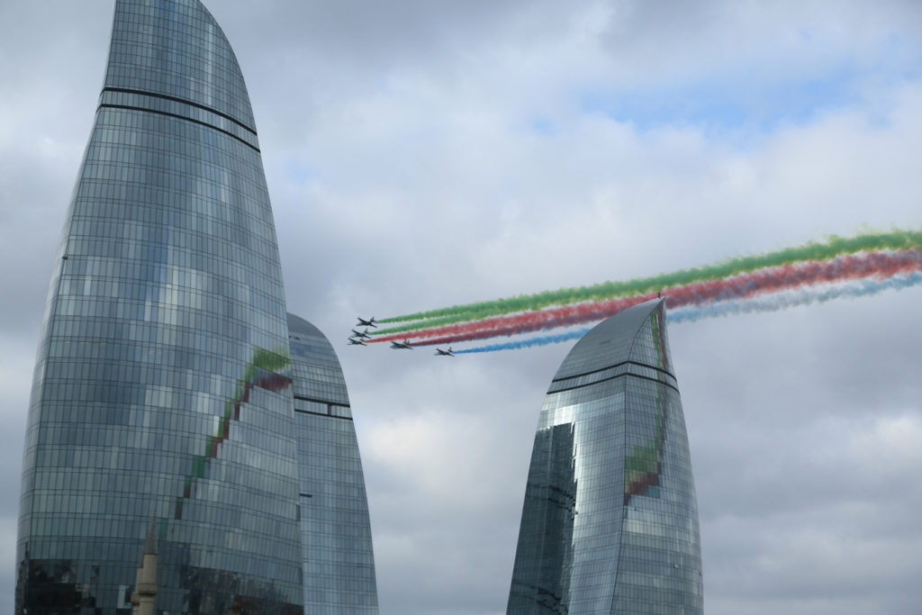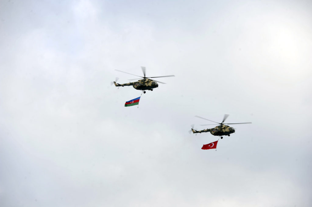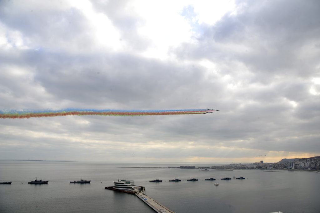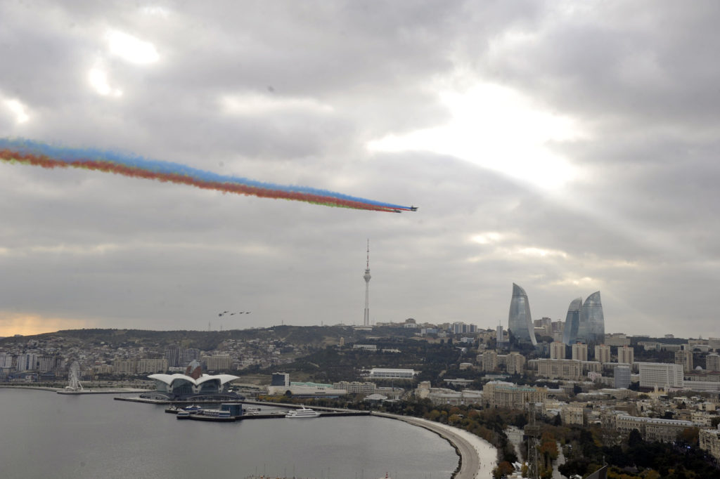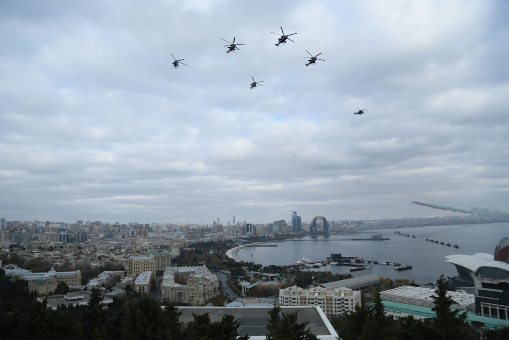 Bundan sonra Azadlıq meydanı üzərində Azərbaycan Hərbi Hava Qüvvələrinə məxsus döyüş təyyarələrinin və helikopterlərin uçuşu başladı. “Qarabağ” ordenli polkovnik Həsən Əlövsətovun rəhbərlik etdiyi “Mİ-17” hərbi nəqliyyat-desant helikopterləri cütlüyü Azərbaycan və Türkiyə respublikalarının dövlət bayraqları ilə Bakı buxtasının üzərindən uçaraq Zəfər paradının iştirakçılarını salamladı. Bunun ardınca Vətən Müharibəsi Qəhrəmanı polkovnik-leytenant Rəşad Nadirovun başçılığı ilə “Mİ-35” hücum helikopterləri qrupunun uçuşu oldu. Polkovnik-leytenant Rəhim Quluzadənin başçılığı ilə “LAHAT” və “SPAYK” uzunmənzilli raketləri ilə silahlanmış “Mİ-17” helikopterlərinin və “Qarabağ” ordenli polkovnik Zaur Rüstəmovun rəhbərliyi ilə “MİQ-29” çoxməqsədli qırıcı təyyarələr qruplarının uçuşları da maraqla qarşılandı. Zəfər paradında döyüş təyyarə və helikopterlərinin çıxışını müasir silahlarla təchiz olunmuş “Su-25” hücum və hava dəstək təyyarələr qrupu tamamladı. Vətən Müharibəsi Qəhrəmanı general-mayor Namiq İslamzadənin başçılıq etdiyi qrupun səmada Azərbaycan Respublikasının dövlət bayrağının təsvirini yaratması üçrəngli şanlı bayrağımızın daim yüksəklərdə dalğalanacağını təcəssüm etdirdi.