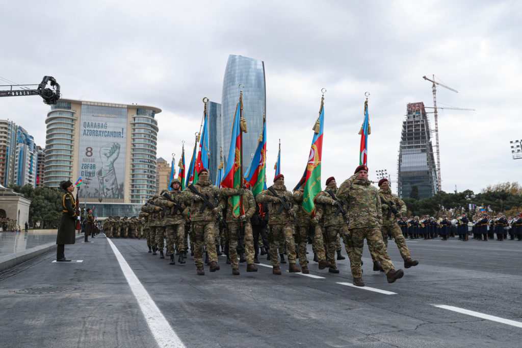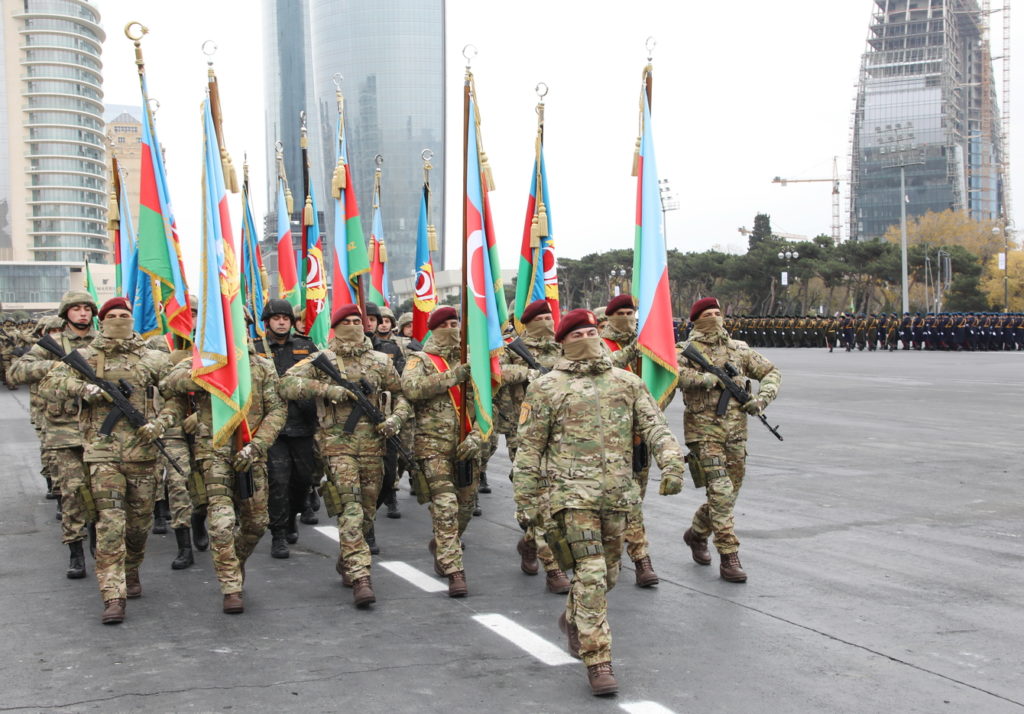 Vətən Müharibəsi Qəhrəmanı general-mayor Zaur Məmmədovun başçılıq etdiyi döyüş bayraqdarları qrupu Böyük Qələbənin qazanılmasında müstəsna xidmətləri olan hərbi hissələrin döyüş bayraqlarını Azadlıq meydanına gətirdi.
