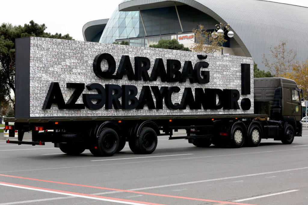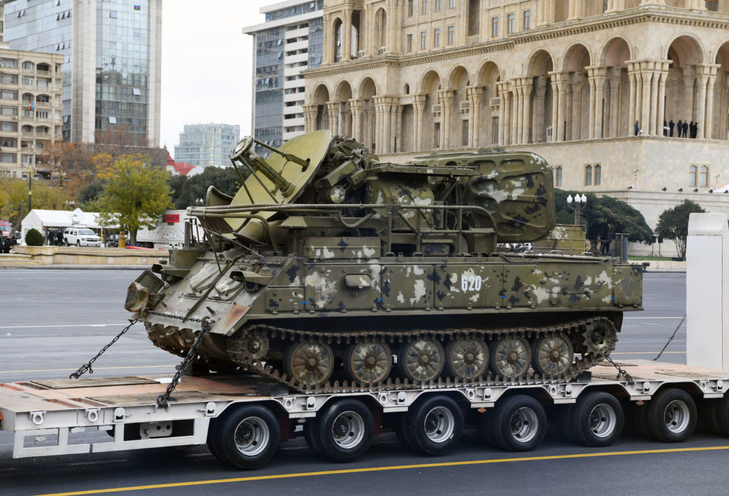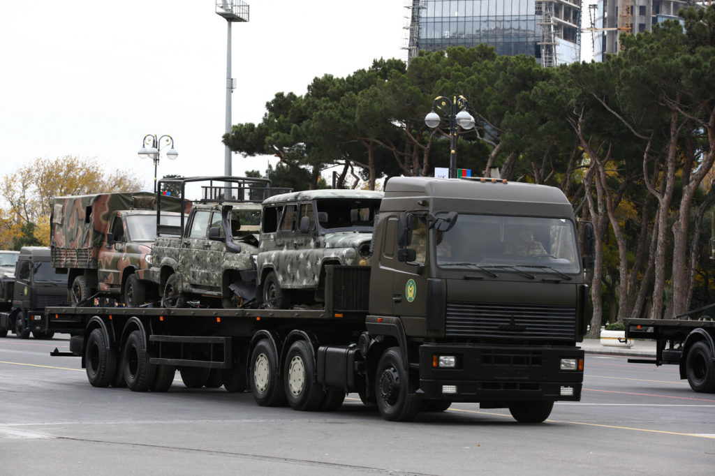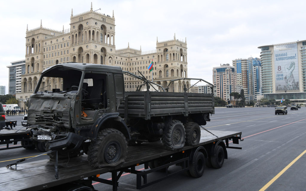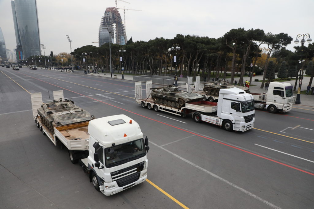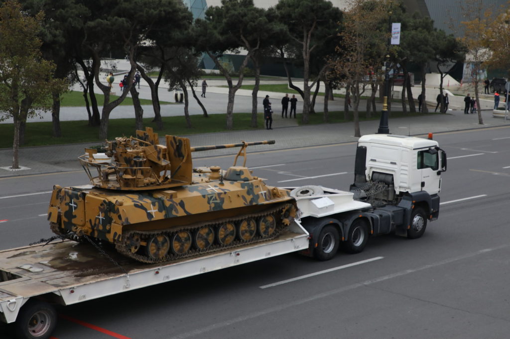 Azadlıq meydanına 44 günlük Vətən müharibəsində düşməndən qənimət götürülmüş hərbi texnikaların bir qismi gətirildi. Vətən müharibəsi zamanı Azərbaycan Silahlı Qüvvələrinin işğaldan azad olunan ərazilərdə ermənilərdən qənimət götürdüyü və sıradan çıxardığı 2 mindən çox avtomobilin nömrə nişanlarından hazırlanan kompozisiya paradda nümayiş olundu. Dağlıq Qarabağ ərazisinin əzəli Azərbaycan torpağı olduğu kompozisiyanın üzərinə həkk olunan “Qarabağ Azərbaycandır!” şüarı ilə bir daha bəyan edilib.