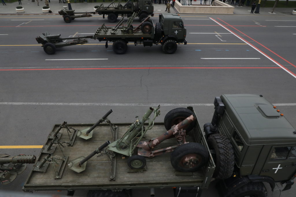 Ardınca Azadlıq meydanına artilleriya silahları sistemlərinin kolonu daxil oldu. Kolona “Zəfər” ordenli general-mayor Ağamir Sultanov başçılıq edirdi. Meydanda özüyeriyən haubitsa və artilleriya qurğuları – 152 millimetrlik “Akasiya”, 152 millimetrlik “MSTA-S”, 203 millimetrlik “Pion”, eləcə də 220 millimetrlik “TOS-1A” ağır odsaçan, tank əleyhinə “Xrizantema-S” kompleksləri, “DANA” özüyeriyən top-haubitsaları, “Qrad”, “RM-70/85”, “BM-21”, “Smerç” yaylım atəşli reaktiv sistemləri, “TR-300 Qasırğa”, “Ekstra” taktiki, “Polonez” və “LORA” əməliyyat-taktiki raket sistemlərinin keçidi oldu.