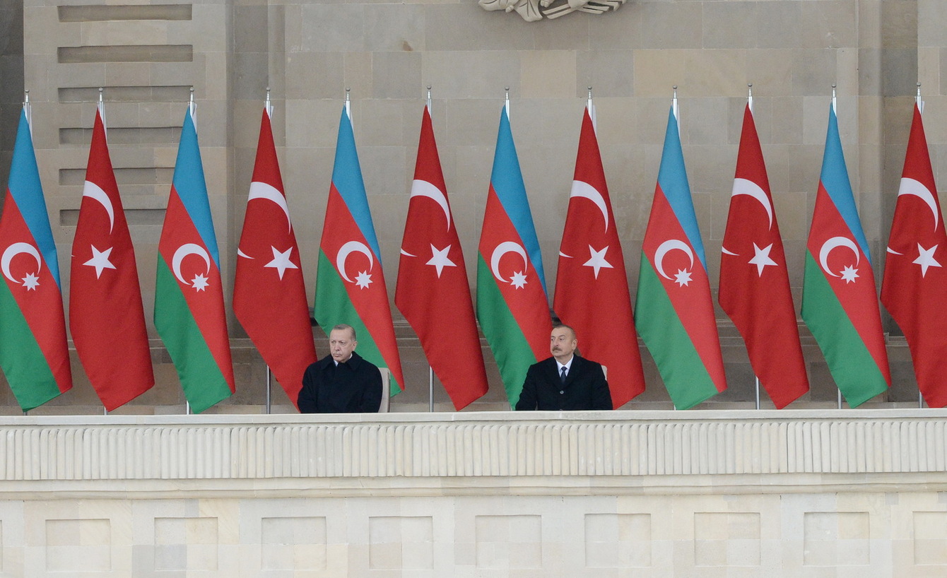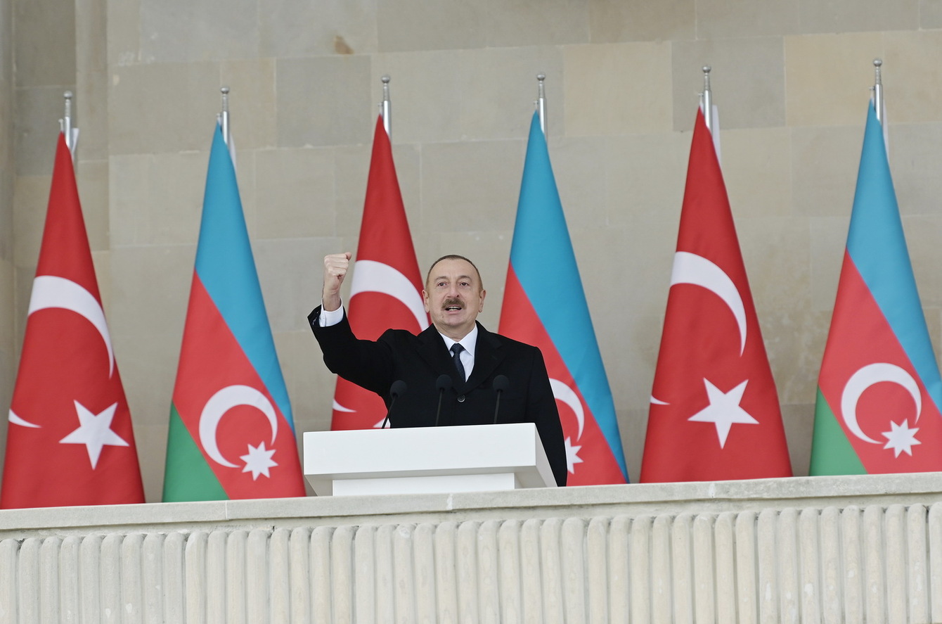 Bu gün tarixi bir gündür. Bu gün Azadlıq meydanında Zəfər paradı keçirilir. Mən çox şadam ki, bu paradda mənim dəvətimi qəbul edərək Türkiyə Cümhuriyyətinin Cümhurbaşqanı, əziz qardaşım Rəcəb Tayyib Ərdoğan iştirak edir. Eyni zamanda, Türkiyədən gəlmiş böyük nümayəndə heyəti, türk əsgər və zabitləri iştirak edirlər. Bu, bir daha bizim birliyimizi, dostluğumuzu və qardaşlığımızı göstərir.