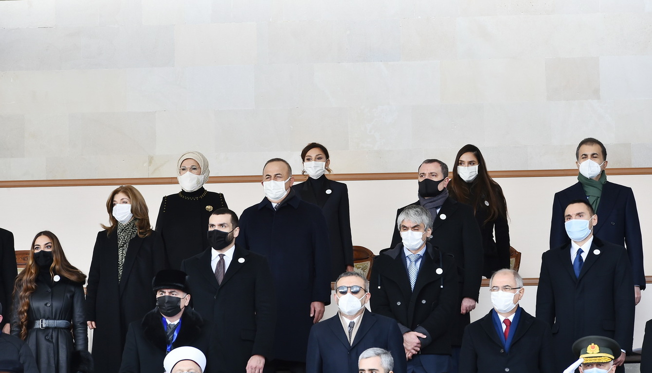 Azərbaycan Respublikasının Prezidenti İlham Əliyev, birinci xanım Mehriban Əliyeva, Türkiyə Respublikasının Prezidenti Rəcəb Tayyib Ərdoğan və xanımı Əminə Ərdoğan Zəfər paradında iştirak ediblər.