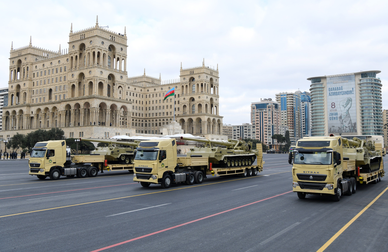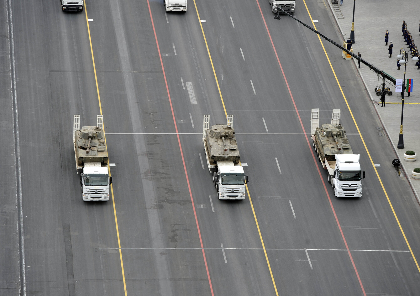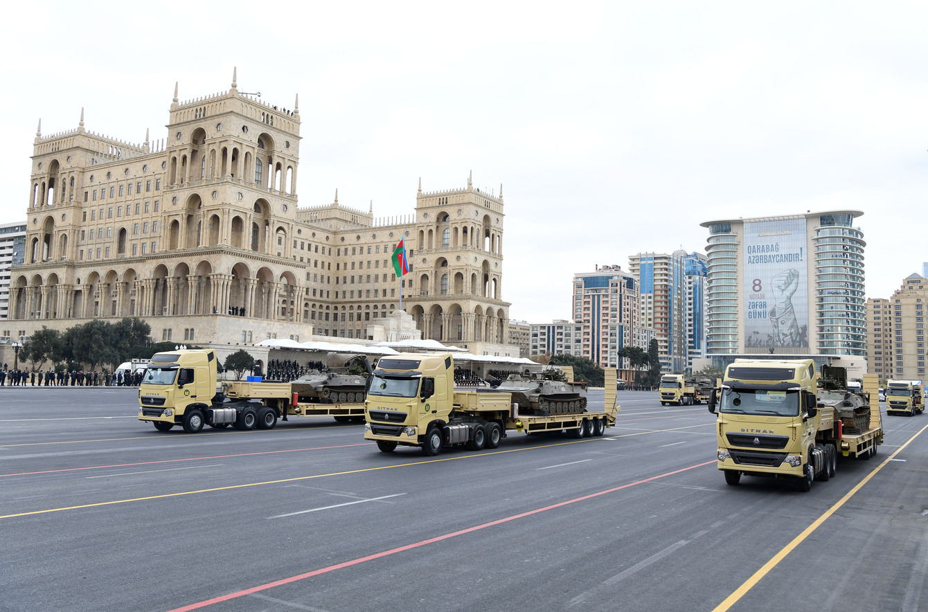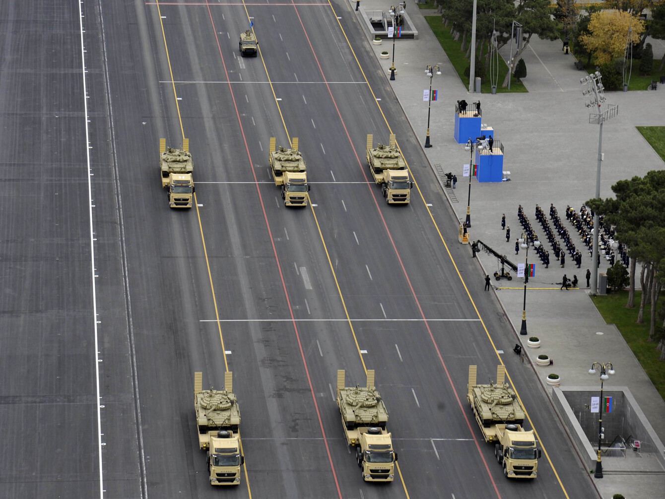 Azadlıq meydanında keçid edən, üzərində 12,7 millimetrlik NSV pulemyotları, tank əleyhinə idarə olunan “SPIKE-ER”, “NLOS”, “LAHAT” raketləri, 120 millimetrlik “SPEAR” minaatanlar quraşdırılan “SandCat-Stormer” zirehli idarəetmə, çevik hərəkət maşınları, piyada daşıyan zirehli maşınlar, “Kobra” və “BTR-82A” zirehli transportyorları, PDM-2 və PDM-3 texnikaları, “T-72”, “T-90S” tankları Azərbaycan Ordusunun hərbi qüdrətini nümayiş etdirdi.