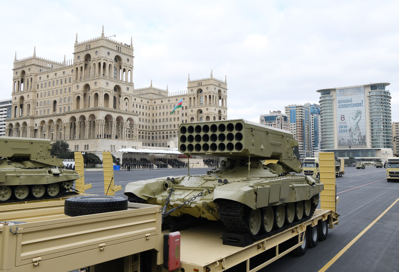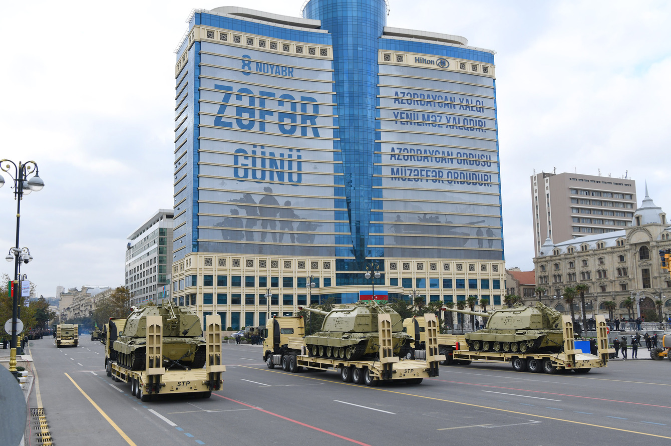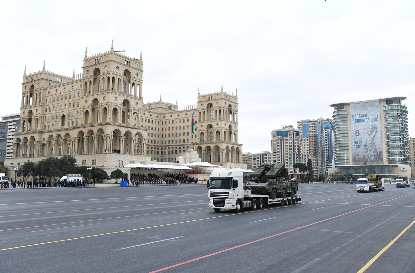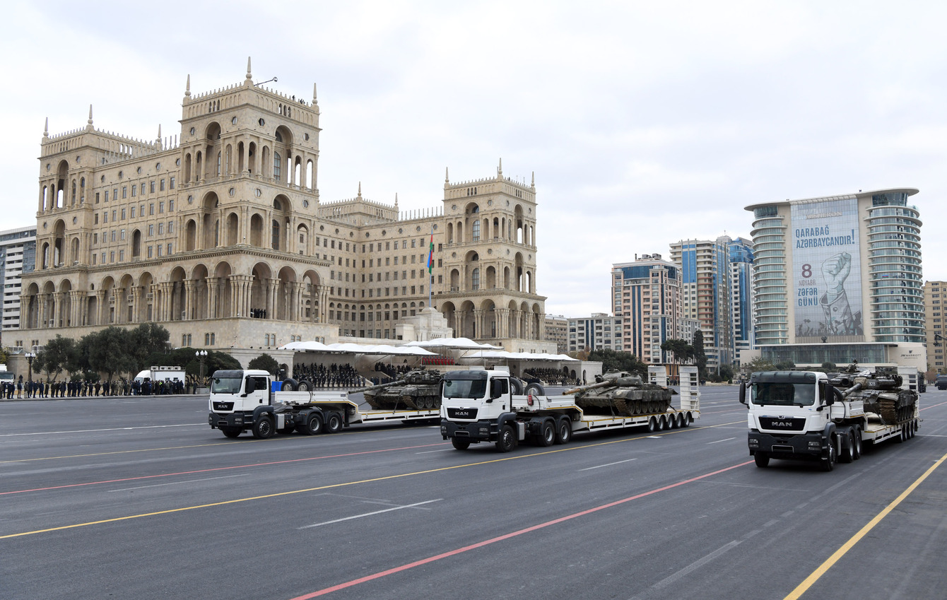 Azadlıq meydanında keçid edən, üzərində 12,7 millimetrlik NSV pulemyotları, tank əleyhinə idarə olunan “SPIKE-ER”, “NLOS”, “LAHAT” raketləri, 120 millimetrlik “SPEAR” minaatanlar quraşdırılan “SandCat-Stormer” zirehli idarəetmə, çevik hərəkət maşınları, piyada daşıyan zirehli maşınlar, “Kobra” və “BTR-82A” zirehli transportyorları, PDM-2 və PDM-3 texnikaları, “T-72”, “T-90S” tankları Azərbaycan Ordusunun hərbi qüdrətini nümayiş etdirdi.