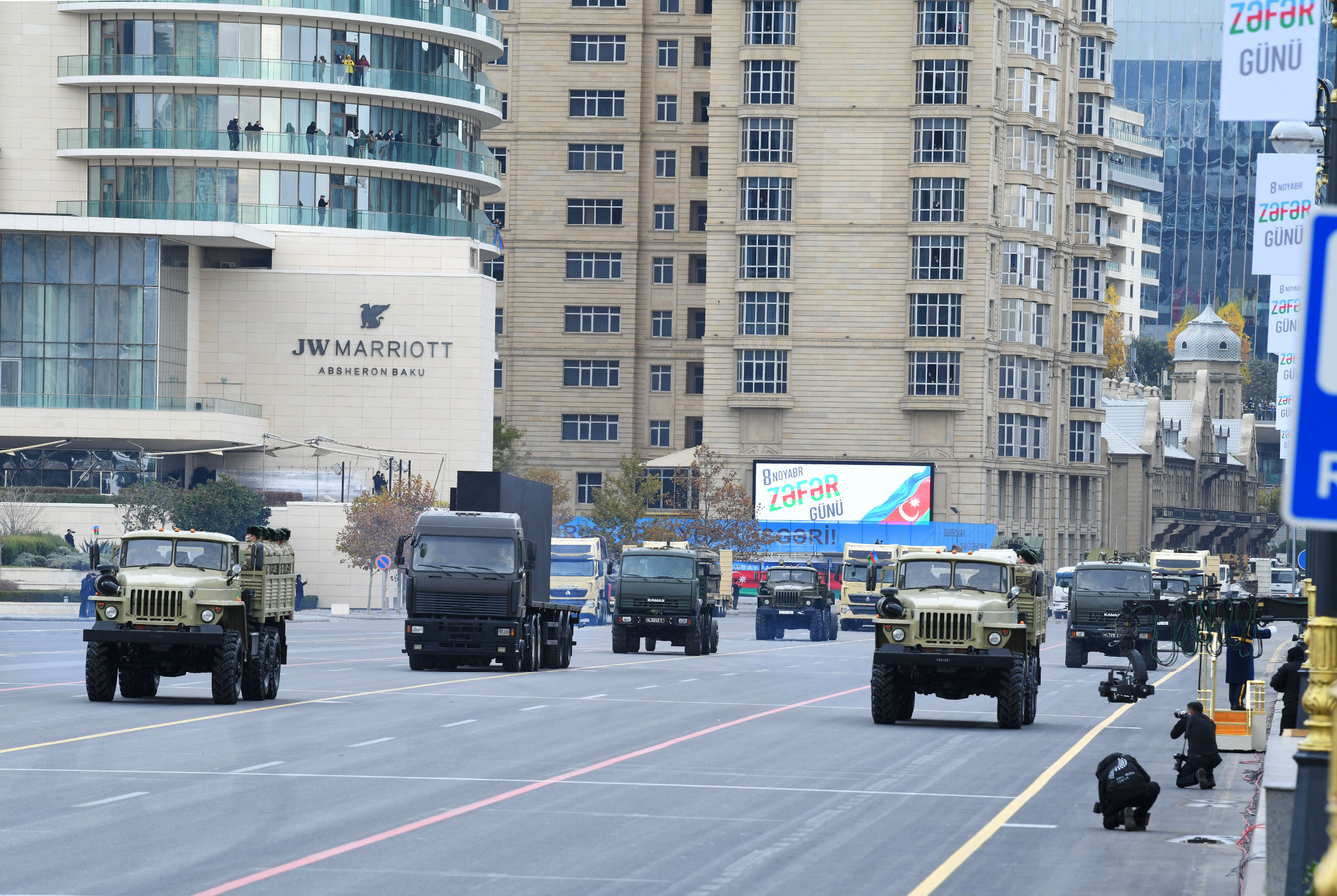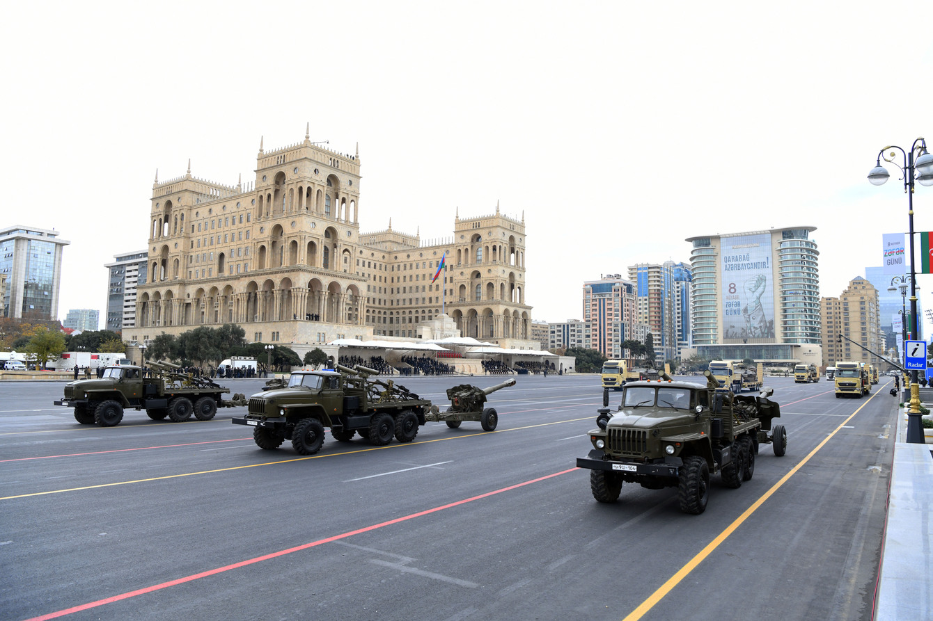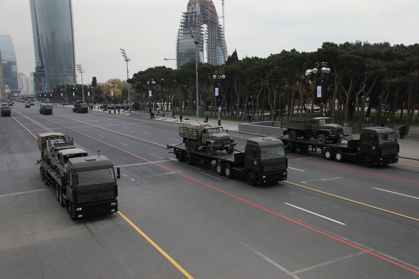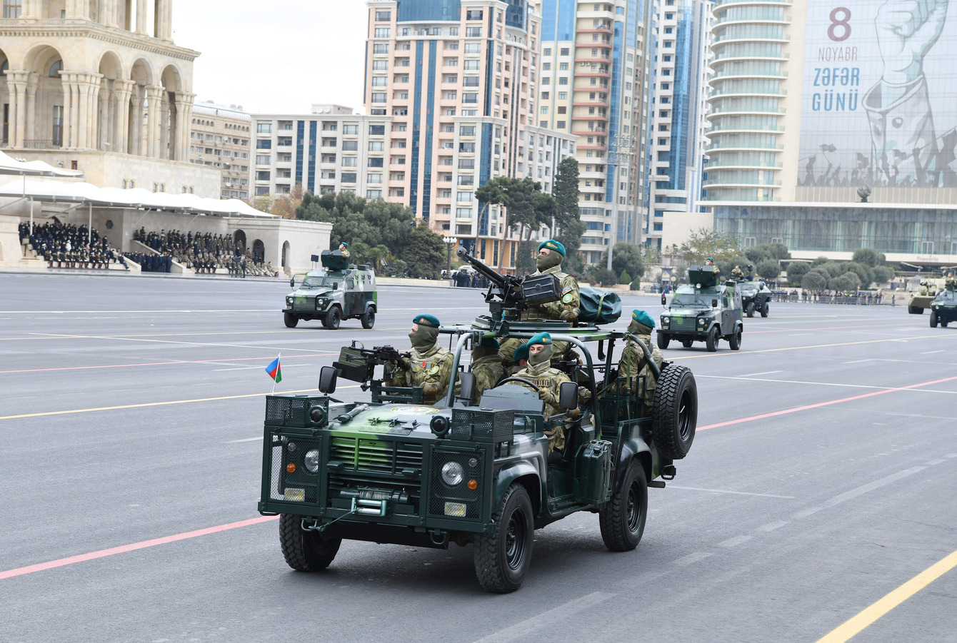 Bundan sonra xüsusi təyinatlı avtomobil, zirehli texnika və silah sistemləri kolonu Azadlıq meydanına daxil oldu. Kolona “Qarabağ” ordenli general-leytenant Nizam Osmanov başçılıq edirdi.