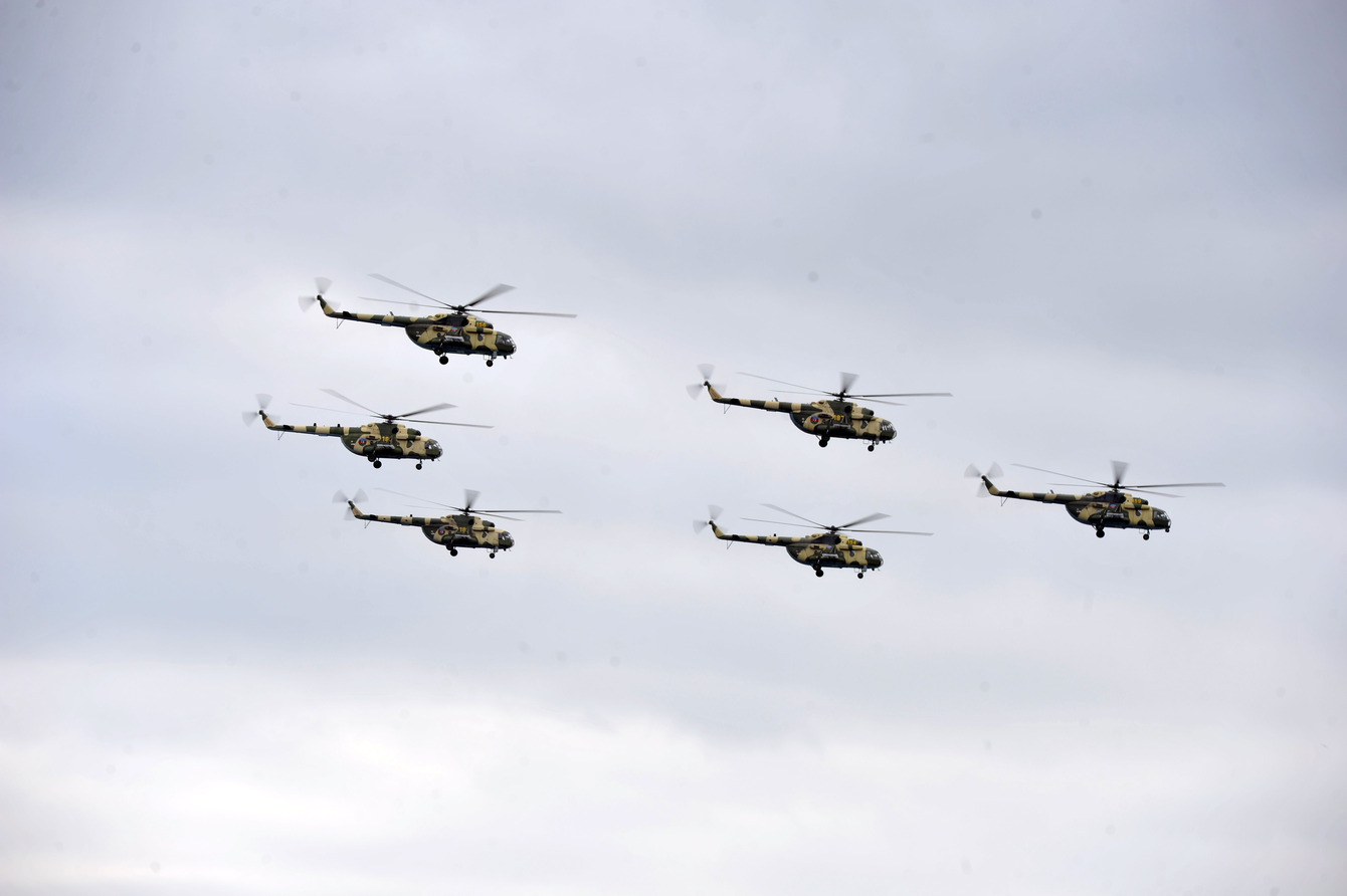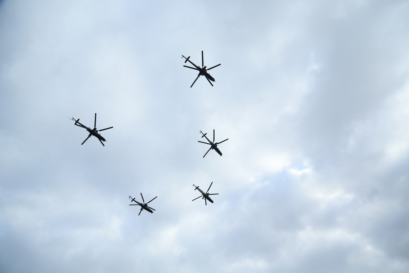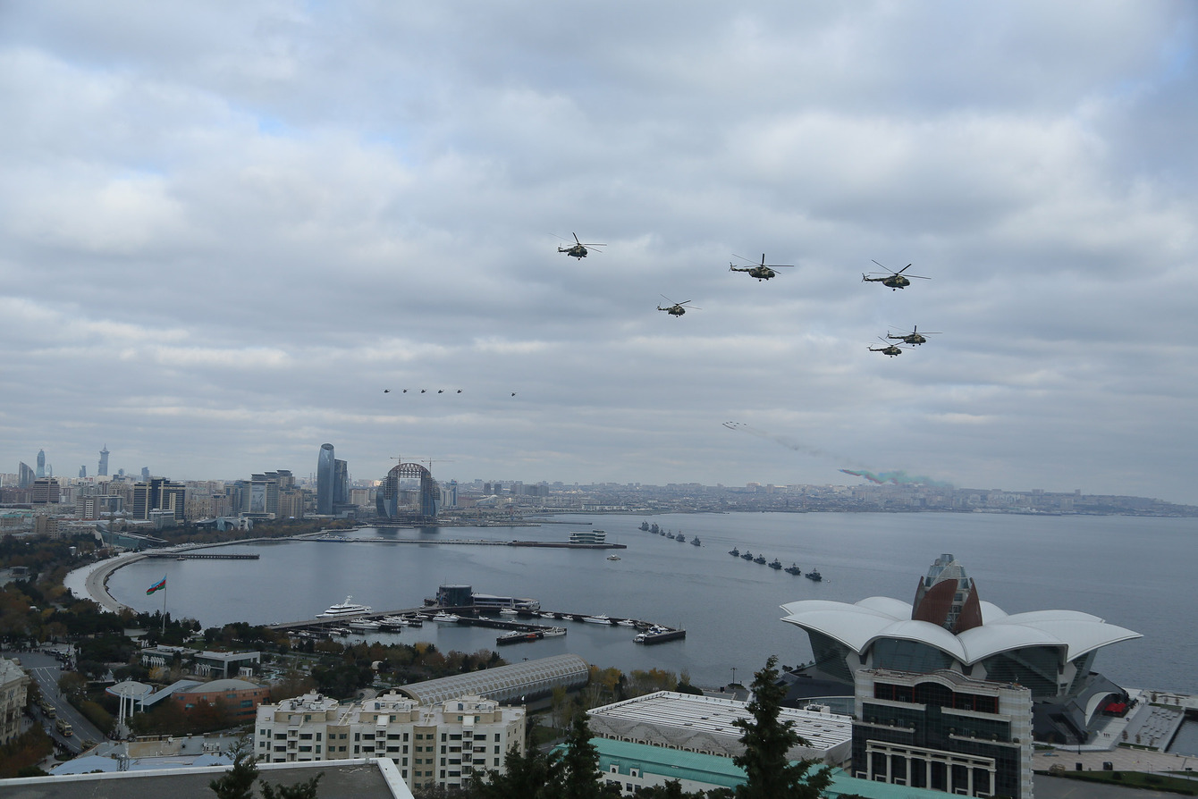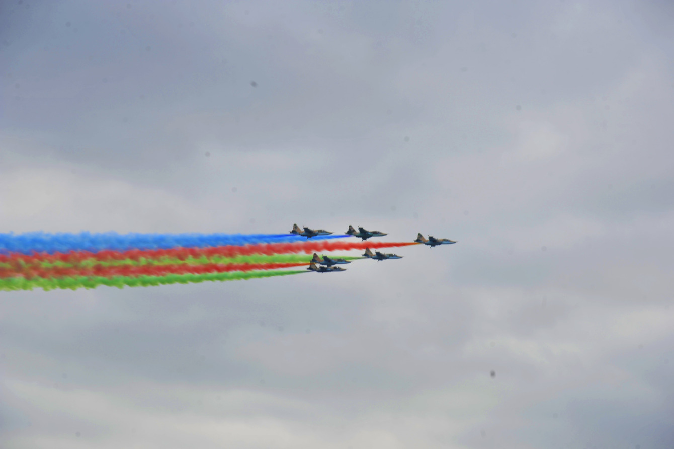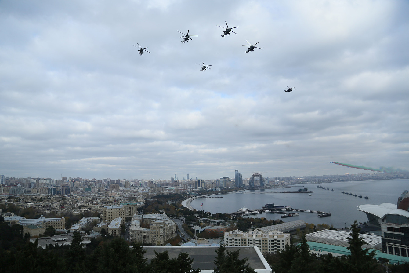 Bundan sonra Azadlıq meydanı üzərində Azərbaycan Hərbi Hava Qüvvələrinə məxsus döyüş təyyarələrinin və helikopterlərin uçuşu başladı. “Qarabağ” ordenli polkovnik Həsən Əlövsətovun rəhbərlik etdiyi “Mİ-17” hərbi nəqliyyat-desant helikopterləri cütlüyü Azərbaycan və Türkiyə respublikalarının dövlət bayraqları ilə Bakı buxtasının üzərindən uçaraq Zəfər paradının iştirakçılarını salamladı. Bunun ardınca Vətən Müharibəsi Qəhrəmanı polkovnik-leytenant Rəşad Nadirovun başçılığı ilə “Mİ-35” hücum helikopterləri qrupunun uçuşu oldu. Polkovnik-leytenant Rəhim Quluzadənin başçılığı ilə “LAHAT” və “SPAYK” uzunmənzilli raketləri ilə silahlanmış “Mİ-17” helikopterlərinin və “Qarabağ” ordenli polkovnik Zaur Rüstəmovun rəhbərliyi ilə “MİQ-29” çoxməqsədli qırıcı təyyarələr qruplarının uçuşları da maraqla qarşılandı. Zəfər paradında döyüş təyyarə və helikopterlərinin çıxışını müasir silahlarla təchiz olunmuş “Su-25” hücum və hava dəstək təyyarələr qrupu tamamladı. Vətən Müharibəsi Qəhrəmanı general-mayor Namiq İslamzadənin başçılıq etdiyi qrupun səmada Azərbaycan Respublikasının dövlət bayrağının təsvirini yaratması üçrəngli şanlı bayrağımızın daim yüksəklərdə dalğalanacağını təcəssüm etdirdi.