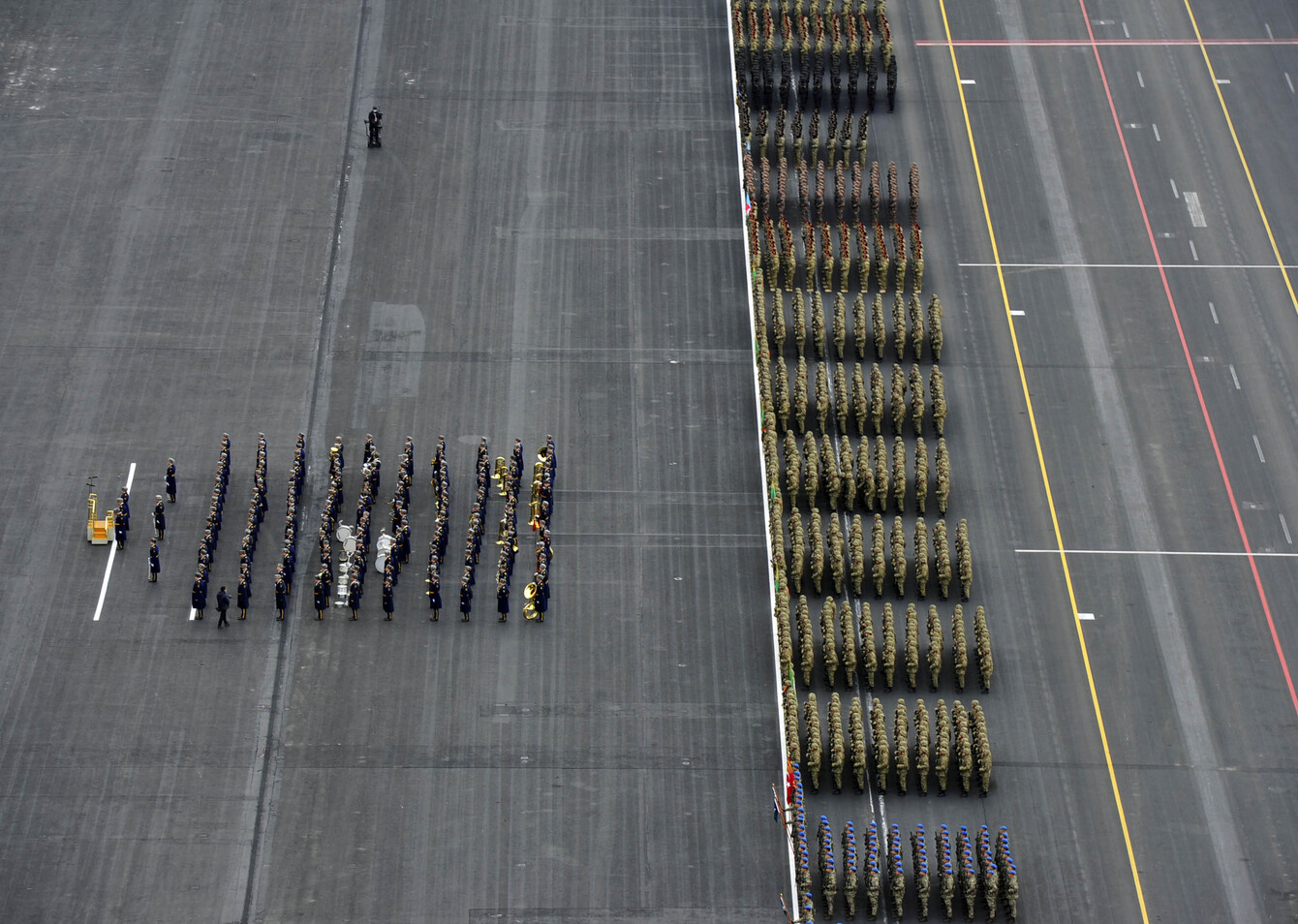 Ardınca Hərbi Dəniz Qüvvələrinin dəniz piyadaları birinci dərəcəli kapitan Zaur Quliyevin başçılığı ilə tribuna önündən keçdilər.