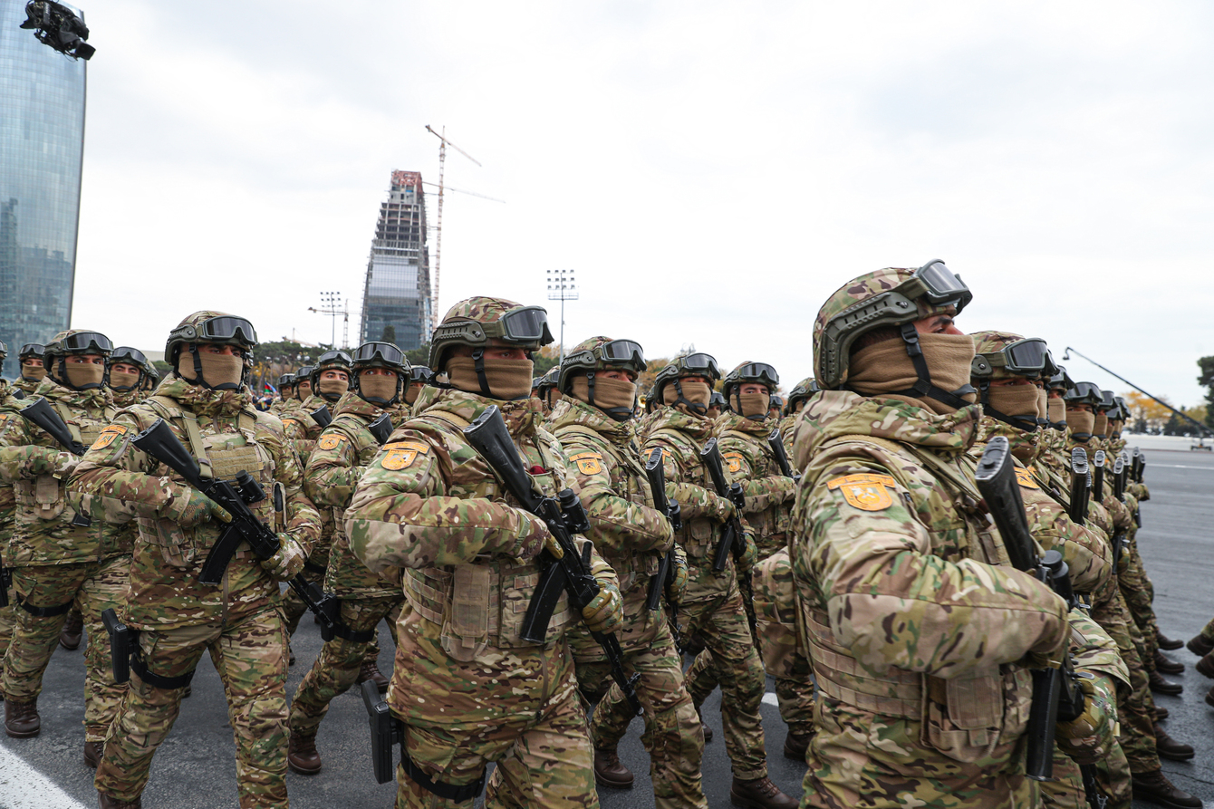 Sonra Vətən müharibəsində müqəddəs döyüşlərdə əsl qəhrəmanlıq, şücaət, rəşadət və yüksək peşəkarlıq nümunələri göstərərək xalqımıza Böyük Qələbənin sevincini yaşadan Müdafiə Nazirliyinin Xüsusi Təyinatlı Qüvvələrinin hərbi qulluqçuları tribunanın önündən keçdilər. Üç kolondan ibarət parad heyətinə Xüsusi Təyinatlı Qüvvələrin komandanı, Vətən Müharibəsi Qəhrəmanı general-leytenant Hikmət Mirzəyev başçılıq edir.