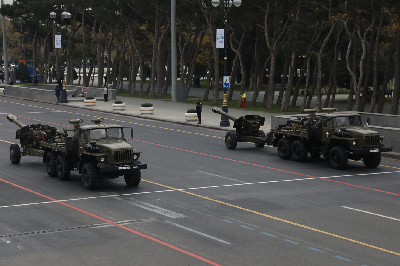 Ardınca Azadlıq meydanına artilleriya silahları sistemlərinin kolonu daxil oldu. Kolona “Zəfər” ordenli general-mayor Ağamir Sultanov başçılıq edirdi. Meydanda özüyeriyən haubitsa və artilleriya qurğuları – 152 millimetrlik “Akasiya”, 152 millimetrlik “MSTA-S”, 203 millimetrlik “Pion”, eləcə də 220 millimetrlik “TOS-1A” ağır odsaçan, tank əleyhinə “Xrizantema-S” kompleksləri, “DANA” özüyeriyən top-haubitsaları, “Qrad”, “RM-70/85”, “BM-21”, “Smerç” yaylım atəşli reaktiv sistemləri, “TR-300 Qasırğa”, “Ekstra” taktiki, “Polonez” və “LORA” əməliyyat-taktiki raket sistemlərinin keçidi oldu.