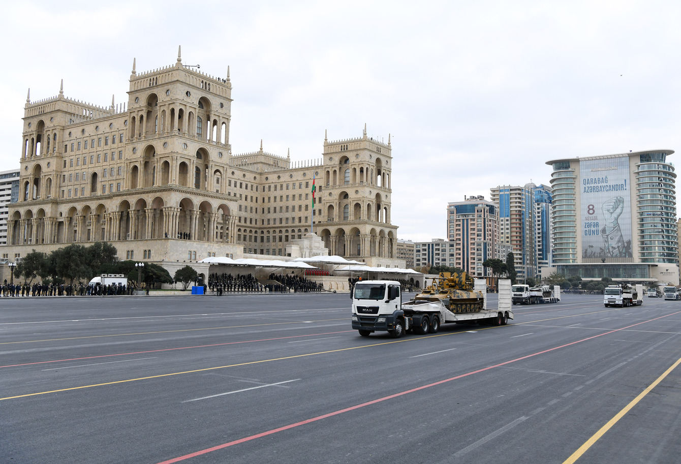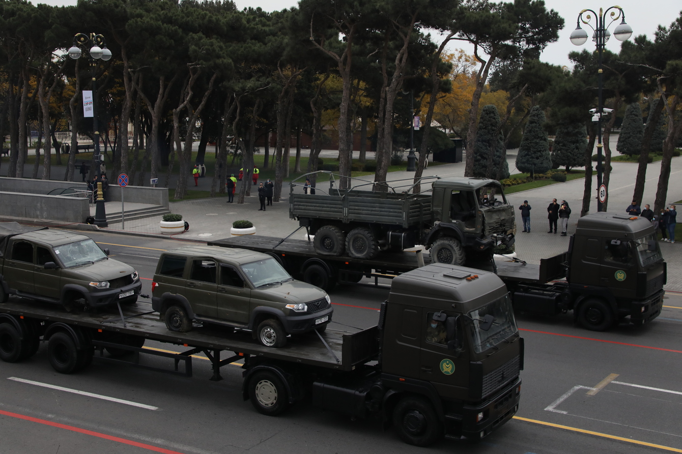 Azadlıq meydanına 44 günlük Vətən müharibəsində düşməndən qənimət götürülmüş hərbi texnikaların bir qismi gətirildi. Vətən müharibəsi zamanı Azərbaycan Silahlı Qüvvələrinin işğaldan azad olunan ərazilərdə ermənilərdən qənimət götürdüyü və sıradan çıxardığı 2 mindən çox avtomobilin nömrə nişanlarından hazırlanan kompozisiya paradda nümayiş olundu. Dağlıq Qarabağ ərazisinin əzəli Azərbaycan torpağı olduğu kompozisiyanın üzərinə həkk olunan “Qarabağ Azərbaycandır!” şüarı ilə bir daha bəyan edilib.